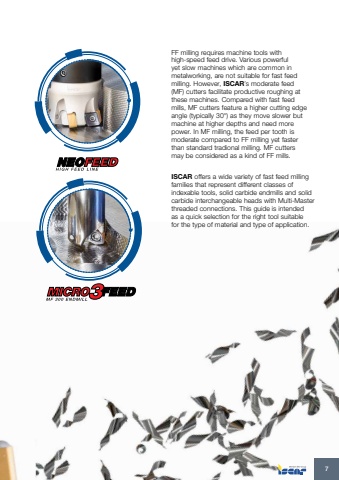 FF milling requires machine tools withhigh-speed feed drive. Various powerful yet slow machines which are common in metalworking, are not suitable for fast feed milling. However, ISCAR%u2019s moderate feed (MF) cutters facilitate productive roughing at these machines. Compared with fast feed mills, MF cutters feature a higher cutting edge angle (typically 30%u00b0) as they move slower but machine at higher depths and need more power. In MF milling, the feed per tooth is moderate compared to FF milling yet faster than standard tradional milling. MF cutters may be considered as a kind of FF mills.ISCAR offers a wide variety of fast feed milling families that represent different classes of indexable tools, solid carbide endmills and solid carbide interchangeable heads with Multi-Master threaded connections. This guide is intended as a quick selection for the right tool suitable for the type of material and type of application. 7