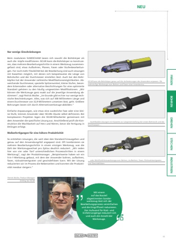 NEUFR%u00c4SEN BOHREN DREHEN STECHEN INDUSTRIENPatrick Muller, Product Manager Drilling bei ISCARMit einem auf das Bauteil abgestimmten Sonderwerkzeug l%u00e4sst sich der Bearbeitungsprozess vereinfachen und die Eingriffszeit reduzieren.Der Aufwand f%u00fcr R%u00fcst- und Einfahrvorg%u00e4nge reduziert sich und auch die Anzahl der Werkzeuge.ISCAR kann die Bohrk%u00f6rper genau auf die Anforderungen des Anwenders anpassen. Ob mehrstufige Werkzeuge zum Bohren und Fasen einer Innenkontur, %u2026%u2026 hochflexible L%u00f6sungen mit Kassette zur L%u00e4ngeneinstellung der ersten Bohrstufe und des Durchmessers %u2026%u2026 oder Multifunktionswerkzeuge zum Bohren, Aufbohren, Fasen, R%u00fcckw%u00e4rtsentgraten und Gewindefr%u00e4sen.Nur wenige Einschr%u00e4nkungenBeim modularen SUMOCHAM lassen sich sowohl die Bohrk%u00f6rper als auch die -k%u00f6pfe modifizieren. ISCAR kann die Bohrk%u00f6rper so konstruieren, dass mehrere Bearbeitungsschritte in einem Werkzeug zusammengefasst sind, etwa Aufbohren, Planen, Fasen oder Stufenbearbeitungen. F%u00fcr noch mehr Flexibilit%u00e4t bei der Bearbeitung sind auch L%u00f6sungen mit Kassetten m%u00f6glich, mit denen sich beispielsweise die L%u00e4nge von Bohrstufen und der Durchmesser einstellen l%u00e4sst. Auch bei den Bohrk%u00f6pfen hat der Anwender zahlreiche Modifikationsm%u00f6glichkeiten. Abweichende Durchmesser, spezielle Spitzenwinkel, kleine Stufen, besondere Eckenradien oder alternative Beschichtungen f%u00fcr eine optimierte Standzeit geh%u00f6ren zu den h%u00e4ufig umgesetzten Modifikationen. %u201eWir k%u00f6nnen die Werkzeuge ganz exakt auf die jeweilige Anwendung abstimmen%u201c, sagt Patrick Muller. %u201eIm Grunde gibt es hier nur wenige technische Beschr%u00e4nkungen. Alles, was sich auf 300 Millimetern L%u00e4nge und einem Durchmesser von 32,9 Millimetern umsetzen l%u00e4sst, geht. Gr%u00f6%u00dfere Bohrungen lassen sich durch Alternativwerkzeuge abbilden.%u201cEinfache Anpassungen, wie etwa eine zus%u00e4tzliche Fase oder eine kleine Stufe, k%u00f6nnen Anwender %u00fcber ISCARs iQuote selbst definieren. Bei komplexeren Projekten legen die ISCAR-Mitarbeiter gemeinsam mit dem Anwender die spezifische L%u00f6sung aus. Anschlie%u00dfend pr%u00fcft die Konstruktion die Machbarkeit auf Herz und Nieren, bevor die Fertigung in Ettlingen erfolgt.Ma%u00dfanfertigungen f%u00fcr eine h%u00f6here Produktivit%u00e4tSo entstehen L%u00f6sungen, die weit %u00fcber den Standard hinausgehen und genau auf den Anwendungsfall angepasst sind. Oft kombinieren sie mehrere Bearbeitungsschritte in einem einzigen Werkzeug, was die Zahl der Werkzeugwechsel pro Zyklus deutlich reduziert. %u201eWir reden hier von vier oder f%u00fcnf unterschiedlichen Prozessschritten in einem Werkzeug%u201c, sagt der Produktmanager. %u201eBeispielsweise haben wir ein 5-in-1-Werkzeug gebaut, mit dem der Anwender bohren, aufbohren, fasen, r%u00fcckw%u00e4rtsentgraten und gewindefr%u00e4sen kann. Mit der L%u00f6sung reduzierten wir im Prozess die Nebenzeiten und konnten die Produktivit%u00e4t messbar steigern.%u201c33
