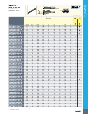 TURNING17LFDCONMSLUa WFCWRE RE CDXDMINRight-hand shownDimensions Tough 1 HardDesignation DCONMS DMIN CDX(1) LU RE LF a WF CW IC228 IC908PICCO R 002.0050-5 .157 .079 .016 .1969 0 .748 .071 .008 .020 %u2022 PICCO R 002.0050-10 .157 .079 .016 .3937 0 .945 .071 .008 .020 %u2022 PICCO R/L 002.0050-15 .157 .079 .016 .5906 0 1.142 .071 .008 .020 %u2022 PICCO R 003.0070-5 .157 .118 .024 .1969 0 .748 .106 .028 .028 %u2022 PICCO R 003.0070-10 .157 .118 .024 .3937 0 .945 .106 .028 .028 %u2022 PICCO R 003.0070-16 .157 .118 .024 .5906 0 1.142 .106 .028 .028 %u2022 PICCO R/L 004.0100-10 .157 .157 .031 .3543 0 .945 .138 .059 .039 %u2022 PICCO R/L 004.0100-16 .157 .157 .031 .5906 0 1.181 .138 .059 .039 %u2022 PICCO R/L 004.0100-20 .157 .157 .031 .7480 0 1.339 .138 .059 .039 %u2022 PICCO R/L 005.0100-10 .197 .197 .039 .3543 0 .984 .173 .075 .039 %u2022 PICCO R/L 005.0100-15 .197 .197 .039 .5512 0 1.181 .173 .075 .039 %u2022 PICCO R/L 005.0100-20 .197 .197 .039 .7480 0 1.378 .173 .075 .039 %u2022 PICCO R/L 005.0100-25 .197 .197 .039 .9449 0 1.575 .173 .075 .039 %u2022 PICCO R/L 005.0100-30 .197 .197 .039 1.1417 0 1.772 .173 .075 .039 %u2022 PICCO R/L 005.0150-10 .197 .197 .039 .3543 0 .984 .173 .075 .059 %u2022 PICCO R/L 005.0150-15 .197 .197 .039 .5512 0 1.181 .173 .075 .059 %u2022 PICCO R 005M0150-15 .197 .197 .039 .5512 .004 1.181 .157 .075 .059 %u2022 PICCO R/L 005.0150-20 .197 .197 .039 .7480 0 1.378 .173 .075 .059 %u2022 PICCO R/L 005.0150-25 .197 .197 .039 .9449 0 1.575 .173 .075 .059 %u2022 PICCO R 005.0150-30 .197 .197 .039 1.1417 0 1.772 .173 .075 .059 %u2022 PICCO R/L 005.0200-10 .197 .197 .039 .3543 0 .984 .173 .075 .079 %u2022 PICCO R/L 005.0200-15 .197 .197 .039 .5512 0 1.181 .173 .075 .079 %u2022 PICCO R/L 005.0200-20 .197 .197 .039 .7480 0 1.378 .173 .075 .079 %u2022 PICCO R 005.0200-25 .197 .197 .039 .9449 0 1.575 .173 .075 .079 %u2022 PICCO R 005.0200-30 .197 .197 .039 1.1417 0 1.772 .173 .075 .079 %u2022 PICCO R/L 006.0100-10 .236 .236 .071 .3543 0 .984 .209 .091 .039 %u2022 PICCO R/L 006.0100-15 .236 .236 .071 .5512 0 1.181 .209 .091 .039 %u2022 PICCO R/L 006.0100-22 .236 .236 .071 .8268 0 1.457 .209 .091 .039 %u2022 PICCO R/L 006.0100-25 .236 .236 .071 .9449 0 1.575 .209 .091 .039 %u2022 PICCO R/L 006.0100-30 .236 .236 .071 1.1417 0 1.772 .209 .091 .039 %u2022 PICCO R/L 006.0150-10 .236 .236 .071 .3543 0 .984 .209 .091 .059 %u2022 PICCO R/L 006.0150-15 .236 .236 .071 .5512 0 1.181 .209 .091 .059 %u2022 PICCO R/L 006.0150-22 .236 .236 .071 .8268 0 1.457 .209 .091 .059 %u2022 PICCO R/L 006.0150-25 .236 .236 .071 .9449 0 1.575 .209 .091 .059 %u2022 PICCO R 006.0150-30 .236 .236 .071 1.1417 0 1.772 .209 .091 .059 %u2022 PICCO R/L 006.0200-10 .236 .236 .071 .3543 0 .984 .209 .091 .079 %u2022 PICCO R/L 006.0200-15 .236 .236 .071 .5512 0 1.181 .209 .091 .079 %u2022 PICCO R 006M0200-15 .236 .236 .071 .5512 .004 1.181 .209 .091 .079 %u2022 PICCO R/L 006.0200-22 .236 .236 .071 .8268 0 1.457 .209 .091 .079 %u2022 PICCO R/L 006.0200-25 .236 .236 .071 .9449 0 1.575 .209 .091 .079 %u2022 PICCO R/L 006.0200-30 .236 .236 .071 1.1417 0 1.772 .209 .091 .079 %u2022 PICCO R/L 007.0100-10 .276 .268 .098 .3543 0 .984 .248 .110 .039 %u2022 PICCO R/L 007.0100-15 .276 .268 .098 .5512 0 1.181 .248 .110 .039 %u2022 PICCO R/L 007.0100-22 .276 .268 .098 .8268 0 1.457 .248 .110 .039 %u2022 PICCO R/L 007.0100-25 .276 .268 .098 .9449 0 1.575 .248 .110 .039 %u2022 PICCO R/L 007.0100-30 .276 .268 .098 1.1417 0 1.772 .248 .110 .039 %u2022 PICCO R/L 007.0150-10 .276 .268 .098 .3543 0 .984 .248 .110 .059 %u2022 PICCO R/L 007.0150-15 .276 .268 .098 .5512 0 1.181 .248 .110 .059 %u2022 PICCO R/L 007.0150-22 .276 .268 .098 .8268 0 1.457 .248 .110 .059 %u2022 PICCO R/L 007.0150-25 .276 .268 .098 .9449 0 1.575 .248 .110 .059 %u2022 PICCO R/L 007.0150-30 .276 .268 .098 1.1417 0 1.772 .248 .110 .059 %u2022 PICCO R/L 007.0200-10 .276 .268 .098 .3543 0 .984 .248 .110 .079 %u2022 PICCO R/L 007.0200-15 .276 .268 .098 .5512 0 1.181 .248 .110 .079 %u2022 PICCO R 007M0200-15 .276 .268 .098 .5512 .004 1.181 .248 .110 .079 %u2022 PICCO R/L 007.0200-22 .276 .268 .098 .8268 0 1.457 .248 .110 .079 %u2022 PICCO R/L 007.0200-25 .276 .268 .098 .9449 0 1.575 .248 .110 .079 %u2022 PICCO R/L 007.0200-30 .276 .268 .098 1.1417 0 1.772 .248 .110 .079 %u2022 %u2022 All carbide bars with sharp corners %u2022 Specify right- or left-hand bars (1) Cutting depth maximum PICCO R/L 002-007Inserts for Internal Grooving and Turning