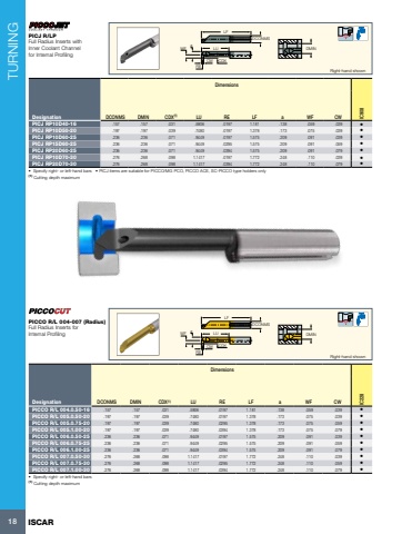 TURNING18 ISCARLFDCONMSWF LU aCWRECDXDMINRight-hand shownDimensionsDesignation DCONMS DMIN CDX(1) LU RE LF a WF CW IC908PICJ RP10D40-16 .157 .157 .031 .5906 .0197 1.181 .138 .059 .039 %u2022 PICJ RP10D50-20 .197 .197 .039 .7480 .0197 1.378 .173 .075 .039 %u2022 PICJ RP10D60-25 .236 .236 .071 .9449 .0197 1.575 .209 .091 .039 %u2022 PICJ RP15D60-25 .236 .236 .071 .9449 .0295 1.575 .209 .091 .059 %u2022 PICJ RP20D60-25 .236 .236 .071 .9449 .0394 1.575 .209 .091 .079 %u2022 PICJ RP10D70-30 .276 .268 .098 1.1417 .0197 1.772 .248 .110 .039 %u2022 PICJ RP20D70-30 .276 .268 .098 1.1417 .0394 1.772 .248 .110 .079 %u2022 %u2022 Specify right- or left-hand bars %u2022 PICJ items are suitable for PICCO/MG PCO, PICCO ACE, SC-PICCO type holders only(1) Cutting depth maximum PICJ R/LPFull Radius Inserts with Inner Coolant Channel for Internal ProfilingLFDCONMSWF LU aCWRECDXDMINRight-hand shownDimensionsDesignation DCONMS DMIN CDX(1) LU RE LF a WF CW IC228PICCO R/L 004.0.50-16 .157 .157 .031 .5906 .0197 1.181 .138 .059 .039 %u2022 PICCO R/L 005.0.50-20 .197 .197 .039 .7480 .0197 1.378 .173 .075 .039 %u2022 PICCO R/L 005.0.75-20 .197 .197 .039 .7480 .0295 1.378 .173 .075 .059 %u2022 PICCO R/L 005.1.00-20 .197 .197 .039 .7480 .0394 1.378 .173 .075 .079 %u2022 PICCO R/L 006.0.50-25 .236 .236 .071 .9449 .0197 1.575 .209 .091 .039 %u2022 PICCO R/L 006.0.75-25 .236 .236 .071 .9449 .0295 1.575 .209 .091 .059 %u2022 PICCO R/L 006.1.00-25 .236 .236 .071 .9449 .0394 1.575 .209 .091 .079 %u2022 PICCO R/L 007.0.50-30 .276 .268 .098 1.1417 .0197 1.772 .248 .110 .039 %u2022 PICCO R/L 007.0.75-30 .276 .268 .098 1.1417 .0295 1.772 .248 .110 .059 %u2022 PICCO R/L 007.1.00-30 .276 .268 .098 1.1417 .0394 1.772 .248 .110 .079 %u2022 %u2022 Specify right- or left-hand bars(1) Cutting depth maximum PICCO R/L 004-007 (Radius)Full Radius Inserts for Internal Profiling