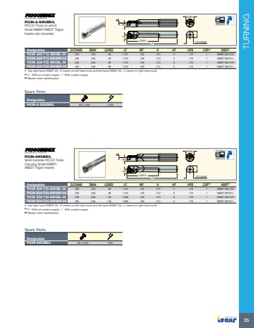 TURNING25WFLDREDLFHFHFBDMINHDCONMS93%u00baDesignation DCONMS DMIN LDRED LF WF H HF HFB CSP(1) MIID(2)PICIN A06-T15-SWUBL-06 .236 .256 .59 1.181 .128 .213 0 .118 1 WBMT 060101RPICIN A06-T15-SWUBR-06 .236 .256 .59 1.181 .128 .213 0 .118 1 WBMT 060101LPICIN A06-T25-SWUBL-06 .236 .256 .98 1.575 .128 .213 0 .118 1 WBMT 060101RPICIN A06-T25-SWUBR-06 .236 .256 .98 1.575 .128 .213 0 .118 1 WBMT 060101L%u2022 Use right-hand WBMT 06...R inserts on left-hand tools and left-hand WBMT 06...L inserts on right-hand tools(1) 0 - Without coolant supply, 1 - With coolant supply (2) Master insert identification Spare PartsDesignationPICIN-A-SWUBR/L SR 14-552 T-6/5PICIN-A-SWUBR/LPICCO Tools on which Small WBMT/WBGT Trigon Inserts are mountedWFLDREDLFHFHFBDMINHDCONMS93%u00baDesignation DCONMS DMIN LDRED LF WF H HF HFB CSP(1) MIID(2)PICIN E06-T25-SWUBL-06 .236 .256 .98 1.575 .128 .213 0 .118 1 WBMT 060101RPICIN E06-T25-SWUBR-06 .236 .256 .98 1.575 .128 .213 0 .118 1 WBMT 060101LPICIN E06-T35-SWUBL-06 .236 .256 1.38 1.968 .128 .213 0 .118 1 WBMT 060101RPICIN E06-T35-SWUBR-06 .236 .256 1.38 1.968 .128 .213 0 .118 1 WBMT 060101L%u2022 Use right-hand WBMT 06...R inserts on left-hand tools and left-hand WBMT 06...L inserts on right-hand tools(1) 0 - Without coolant supply, 1 - With coolant supply (2) Master insert identification Spare PartsDesignationPICIN-SWUBR/L SR 14-552 T-6/5PICIN-SWUBR/LSolid Carbide PICCO Tools Carrying Small WBMT/WBGT Trigon Inserts