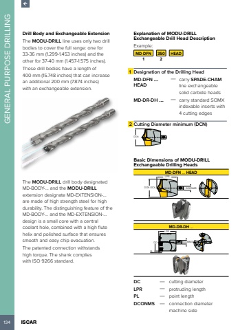 134 ISCAR GENERAL PURPOSE DRILLINGDrill Body and Exchangeable ExtensionThe MODU-DRILL line uses only two drill bodies to cover the full range: one for 33-36 mm (1.299-1.453 inches) and the other for 37-40 mm (1.457-1.575 inches). These drill bodies have a length of 400 mm (15.748 inches) that can increase an additional 200 mm (7.874 inches) with an exchangeable extension. The MODU-DRILL drill body designated MD-BODY-%u2026 and the MODU-DRILLextension designate MD-EXTENSION-%u2026are made of high strength steel for high durability. The distinguishing feature of the MD-BODY-... and the MD-EXTENSION-%u2026design is a small core with a central coolant hole, combined with a high flute helix and polished surface that ensures smooth and easy chip evacuation. The patented connection withstands high torque. The shank complies with ISO 9266 standard. Explanation of MODU-DRILL Exchangeable Drill Head Description Example:MD-DFN 350 HEAD1 21 Designation of the Drilling HeadMD-DFN %u2026HEAD%u2014 carry SPADE-CHAMline exchangeable solid carbide headsMD-DR-DH %u2026 %u2014 carry standard SOMX indexable inserts with 4 cutting edges2 Cutting Diameter minimum (DCN) DCNBasic Dimensions of MODU-DRILL Exchangeable Drilling HeadsMD-DFN %u2026 HEADDCONMSLPRDCN-DCXMD-DR-DH %u2026DCONMSLPRDCPLDC %u2014 cutting diameterLPR %u2014 protruding lengthPL %u2014 point lengthDCONMS %u2014 connection diameter machine side
