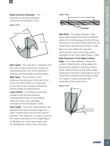 15GENERAL DRILLING HANDBOOKBody Clearance Diameter - The diameter of the body clearance behind the lands (Figure 1.2.17).Figure 1.2.17body clearance diameterdrill diameterBack Taper - The reduction in diameter from the outer corners towards the shank. It is expressed by the ratio of the reduction in diameter and the length of measurement.Web Taper - The increase in web thickness from the point of the drill to the shank end of the flutes. It is expressed by the ratio of the increase in thickness and the length of measurement.Lead of Helix - The distance measured parallel to the drill axis between corresponding points on the leading edge of a land in one complete revolution of the land (Figure 1.2.18).Helix Angle - The acute angle between the tangent to the helical leading edge and a plane containing the axis and the point in question. This angle lies in a plane normal to the radius at the point on the edge (Figure 1.2.18). Note 1 to entry: Helix angles may be classified as normal, slow and quick.Figure 1.2.18lead of helix helix angle Side Rake - The angle between a face and a plane passing through the selected point on the cutting edge and the drill axis, measured in the plane perpendicular to the radius at the selected point (Figure 1.2.19).Note 1 to entry: When the selected point is at the outer corner, this angle is equivalent to the helix angle (Figure 1.2.18).Side Clearance of The Major Cutting Edge - The angle between a flank and a plane containing the cutting edge and the assumed direction of primary motion at the selected point on the cutting edge, measured in the plane perpendicular to the radius at the selected point (Figure 1.2.19). This angle is usually specified and measured at the outer corner.Figure 1.2.19side rake side clearance of the major cutting edge