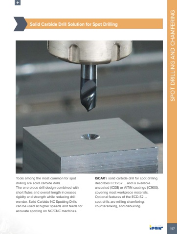 197SPOT DRILLING AND CHAMFERING%u00bd%u0009Solid Carbide Drill Solution for Spot DrillingTools among the most common for spot drilling are solid carbide drills. The one-piece drill design combined with short flutes and overall length increases rigidity and strength while reducing drill wander. Solid Carbide NC Spotting Drills can be used at higher speeds and feeds for accurate spotting on NC/CNC machines. ISCAR%u2019s solid carbide drill for spot drilling describes ECD-S2 %u2026 and is available uncoated (IC08) or AlTiN coatings (IC900), covering most workpiece materials. Optional features of the ECD-S2 %u2026spot drills are milling chamfering, countersinking, and deburring.