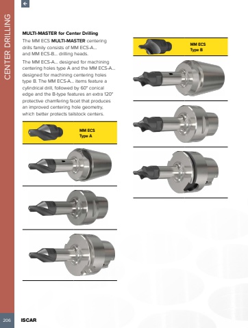 206 ISCAR CENTER DRILLINGMULTI-MASTER for Center DrillingThe MM ECS MULTI-MASTER centering drills family consists of MM ECS-A%u2026and MM ECS-B%u2026 drilling heads. The MM ECS-A%u2026 designed for machining centering holes type A and the MM ECS-A%u2026designed for machining centering holes type B. The MM ECS-A%u2026 items feature a cylindrical drill, followed by 60%u00b0 conical edge and the B-type features an extra 120%u00b0 protective chamfering facet that produces an improved centering hole geometry, which better protects tailstock centers. MM ECSType AMM ECS Type B