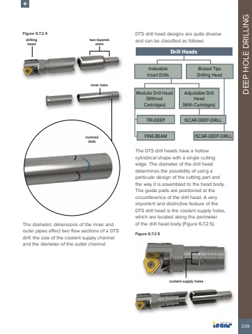 239DEEP HOLE DRILLINGFigure 6.7.2.4drilling headtwo-layered steminner tubeinclined slotsThe diametric dimensions of the inner and outer pipes affect two flow sections of a DTS drill: the size of the coolant supply channel and the diameter of the outlet channel.DTS drill head designs are quite diverse and can be classified as follows:Drill HeadsModular Drill Head (WithoutCartridges)Adjustable Drill Head(With Cartridges)TRI-DEEP ISCAR-DEEP-DRILLIndexable Insert DrillsBrazed TipsDrilling HeadFINE-BEAM ISCAR-DEEP-DRILLThe DTS drill heads have a hollow cylindrical shape with a single cutting edge. The diameter of the drill head determines the possibility of using a particular design of the cutting part and the way it is assembled to the head body. The guide pads are positioned at the circumference of the drill head. A very important and distinctive feature of the DTS drill head is the coolant supply holes, which are located along the perimeter of the drill head body (Figure 6.7.2.5).Figure 6.7.2.5coolant supply holes