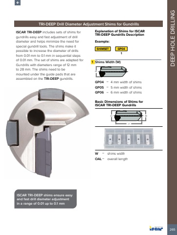 265DEEP HOLE DRILLINGTRI-DEEP Drill Diameter Adjustment Shims for GundrillsISCAR TRI-DEEP includes sets of shims for gundrills easy and fast adjustment of drill diameter and helps minimize the need for special gundrill tools. The shims make it possible to increase the diameter of drills from 0.01 mm to 0.1 mm in sequential steps of 0.01 mm. The set of shims are adapted for Gundrills with diameters range of 12 mm to 28 mm. The shims need to be mounted under the guide pads that are assembled on the TRI-DEEP gundrills.ISCAR TRI-DEEP shims ensure easy and fast drill diameter adjustment in a range of 0.01 up to 0.1 mmExplanation of Shims for ISCAR TRI-DEEP Gundrills DescriptionExample:SHIMSET GP0411 Shims Width (W)DCGP04 %u2013 4 mm width of shimsGP05 %u2013 5 mm width of shimsGP06 %u2013 6 mm width of shimsBasic Dimensions of Shims for ISCAR TRI-DEEP GundrillsDC BDW %u2013 shims widthOAL %u2013 overall length