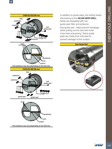 293DEEP HOLE DRILLING%u00d8169.00-232.99 mmfillerProtectorprotectorprotectorsub guide padperipheralinnercentralInnerPart positions may vary depending on the drill size. %u00d8233.00-291.99 mmguide pad guide padprotectorprotectorsub guide padfillerperipheralInnerinnercentralPart positions may vary depending on the drill size. In addition to guide pads, the drilling heads that belong to the ISCAR-DEEP-DRILLfamily are equipped with sub guide pad, filler, and protector.Sub guide pad - helps prevent breakage while pulling out the tool from hole/cross-hole processing. These guide pads are made from soft steel to prevent damage to the surface.Sub Guide Pad