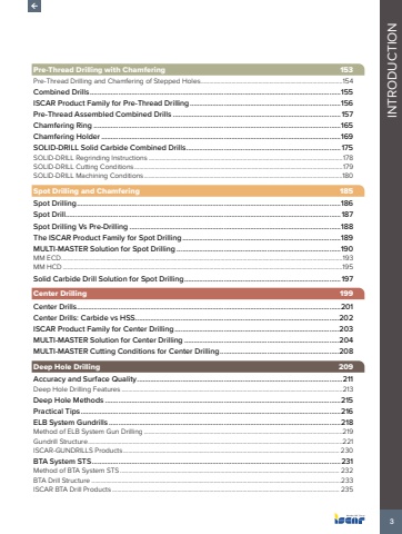 3 INTRODUCTIONPre-Thread Drilling with Chamfering 153Pre-Thread Drilling and Chamfering of Stepped Holes.........................................................................................154Combined Drills.....................................................................................................................................155ISCAR Product Family for Pre-Thread Drilling................................................................................156Pre-Thread Assembled Combined Drills .........................................................................................157Chamfering Ring ...................................................................................................................................165Chamfering Holder...............................................................................................................................169SOLID-DRILL Solid Carbide Combined Drills..................................................................................175SOLID-DRILL Regrinding Instructions ..........................................................................................................................178SOLID-DRILL Cutting Conditions...................................................................................................................................179SOLID-DRILL Machining Conditions.............................................................................................................................180Spot Drilling and Chamfering 185Spot Drilling............................................................................................................................................186Spot Drill..................................................................................................................................................187Spot Drilling Vs Pre-Drilling ................................................................................................................188The ISCAR Product Family for Spot Drilling....................................................................................189MULTI-MASTER Solution for Spot Drilling .......................................................................................190MM ECD.................................................................................................................................................................................193MM HCD................................................................................................................................................................................195Solid Carbide Drill Solution for Spot Drilling...................................................................................197Center Drilling 199Center Drills............................................................................................................................................201Center Drills: Carbide vs HSS............................................................................................................202ISCAR Product Family for Center Drilling.......................................................................................203MULTI-MASTER Solution for Center Drilling ..................................................................................204MULTI-MASTER Cutting Conditions for Center Drilling...............................................................208Deep Hole Drilling 209Accuracy and Surface Quality.............................................................................................................211Deep Hole Drilling Features ...........................................................................................................................................213Deep Hole Methods .............................................................................................................................215Practical Tips..........................................................................................................................................216ELB System Gundrills ...........................................................................................................................218Method of ELB System Gun Drilling .............................................................................................................................219Gundrill Structure................................................................................................................................................................221ISCAR-GUNDRILLS Products........................................................................................................................................ 230BTA System STS....................................................................................................................................231Method of BTA System STS.......................................................................................................................................... 232BTA Drill Structure .............................................................................................................................................................233ISCAR BTA Drill Products ............................................................................................................................................... 235