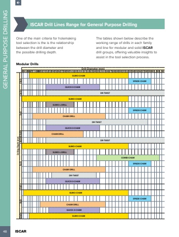 48 ISCAR GENERAL PURPOSE DRILLING %u00bd%u0009ISCAR Drill Lines Range for General Purpose DrillingOne of the main criteria for holemaking tool selection is the is the relationship between the drill diameter and the possible drilling depth.The tables shown below describe the working range of drills in each family and line for modular and solid ISCARdrill groups, offering valuable insights to assist in the tool selection process.Modular DrillsDrill Diameter (mm)4 4.5 5 6 7 7.5 8 9 10 11 12 13 14 15 16 17 18 19 19.5 20 20.9 21 22 23 24 25 25.9 26 27 28 29 30 31 32 33 34 35 36 37 38 39 40 ... 50 ... 60Drilling Depth (mm) 1.5xDSUMO-CHAMSPADE-CHAMQUICK-3-CHAM2xDDR-TWIST3xDSUMO-CHAMSUMO-L-DRILLSPADE-CHAMCHAM-DRILLDR-TWISTQUICK-3-CHAM3.5xDCHAM-DRILL4xDDR-TWIST5xDSUMO-CHAMSUMO-L-DRILLCOMBI-CHAMSPADE-CHAMCHAM-DRILLDR-TWISTQUICK-3-CHAM7xD 8xDSUMO-CHAMSPADE-CHAMCHAM-DRILLQUICK-3-CHAM12xDSUMO-CHAM