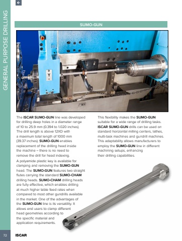 72 ISCAR GENERAL PURPOSE DRILLINGSUMO-GUNThe ISCAR SUMO-GUN line was developed for drilling deep holes in a diameter range of 10 to 25.9 mm (0.394 to 1.020 inches). The drill length is above 12XD with a maximum total length of 1000 mm (39.37 inches). SUMO-GUN enables replacement of the drilling head inside the machine %u2013 there is no need to remove the drill for head indexing.A polyamide plastic key is available for clamping and removing the SUMO-GUNhead. The SUMO-GUN features two straight flutes carrying the standard SUMO-CHAMdrilling heads. SUMO-CHAM drilling heads are fully effective, which enables drilling at much higher table feed rates when compared to most other gundrills available in the market. One of the advantages of the SUMO-GUN line is its versatility. It allows end users to clamp different head geometries according to the specific material and application requirements.This flexibility makes the SUMO-GUNsuitable for a wide range of drilling tasks. ISCAR SUMO-GUN drills can be used on standard horizontal milling centers, lathes, multi-task machines and gundrill machines. This adaptability allows manufacturers to employ the SUMO-GUN line in different machining setups, enhancing their drilling capabilities.