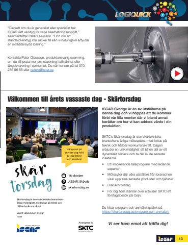 13%u201dOavsett om du %u00e4r generalist eller specialist har ISCAR r%u00e4tt verktyg f%u00f6r varje bearbetningsuppgift,%u201d sammanfattar Peter Olausson. %u201dOch om ett standardverktyg inte r%u00e4cker till kan vi naturligtvis erbjuda en skr%u00e4ddarsydd l%u00f6sning.%u201dKontakta Peter Olausson, produktansvarig svarvning, om du vill prata mer om svarvning i allm%u00e4nhet eller l%u00e4ngdsvarvning i synnerhet. Du n%u00e5r honom p%u00e5 tel 070-276 96 66 eller [email protected]%u00e4lkommen till %u00e5rets vassaste dag - Sk%u00e4rtorsdagISCAR Sverige %u00e4r en av utst%u00e4llarna p%u00e5 denna dag och vi hoppas att du kommer f%u00f6rbi v%u00e5r lilla monter d%u00e4r vi bland annat ber%u00e4ttar om hur vi kan addera v%u00e4rde i din produktion.SKTC%u00b4s Sk%u00e4rtorsdag %u00e4r den sk%u00e4rtekniska branschens %u00e5rliga m%u00f6tesplats, med fokus p%u00e5 teknik och h%u00e5llbar konkurrenskraft. Dagen erbjuder en unik m%u00f6jlighet att bli en del av ett dynamiskt n%u00e4tverk och ta del av de senaste insikterna. %u2022 Ett inspirerande talarprogram med ledande experter%u2022 M%u00f6tesytor d%u00e4r v%u00e5ra utst%u00e4llare fr%u00e5n branschen visar upp sina senaste produkter och tj%u00e4nster%u2022 Branschmiddag%u2022 F%u00f6r dig som stannar %u00f6ver erbjuder SKTC ett f%u00f6retagsbes%u00f6k p%u00e5 CejnDu hittar program och anm%u00e4lningsl%u00e4nk p%u00e5 https://skartorsdag.se/program-och-anmalan/Vi ser fram emot att tr%u00e4ffa dig!