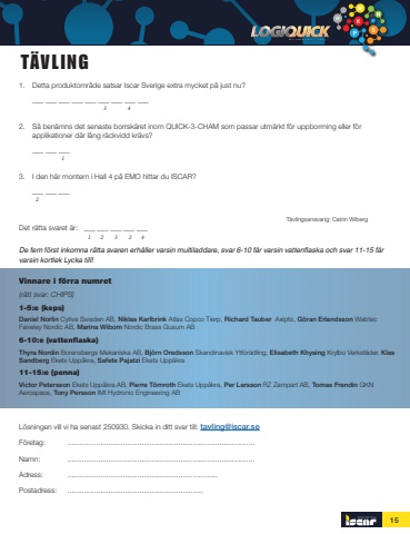 151. Detta produktomr%u00e5de satsar Iscar Sverige extra mycket p%u00e5 just nu?___ ___ ___ ___ ___ ___ ___ ___ ___2. S%u00e5 ben%u00e4mns det senaste borrsk%u00e4ret inom QUICK-3-CHAM som passar utm%u00e4rkt f%u00f6r uppborrning eller f%u00f6r applikationer d%u00e4r l%u00e5ng r%u00e4ckvidd kr%u00e4vs?___ ___ ___3. I den h%u00e4r montern i Hall 4 p%u00e5 EMO hittar du ISCAR? ___ ___ ___ Det r%u00e4tta svaret %u00e4r: ___ ___ ___ ___ ___  1 2 3 2 4 De fem f%u00f6rst inkomna r%u00e4tta svaren erh%u00e5ller varsin multiladdare, svar 6-10 f%u00e5r varsin vattenflaska och svar 11-15 f%u00e5r varsin kortlek Lycka till!L%u00f6sningen vill vi ha senast 250930. Skicka in ditt svar till: [email protected]%u00f6retag: ...........................................................................................Namn: ...........................................................................................Adress: ......................................................................... Postadress: ..................................................................T%u00e4vlingsansvarig: Catrin WibergT%u00c4VLINGVinnare i f%u00f6rra numret(r%u00e4tt svar: CHIPS)1-5:e (keps)Daniel Norlin Cytiva Sweden AB, Niklas Karlbrink Atlas Copco Tierp, Richard Tauber Axipto, G%u00f6ran Erlandsson Wabtec Faiveley Nordic AB, Marina Wibom Nordic Brass Gusum AB6-10:e (vattenflaska)Thyra Nordin Borensbergs Mekaniska AB, Bj%u00f6rn Oredsson Skandinavisk Ytf%u00f6r%u00e4dling, Elisabeth Khysing Krylbo Verkst%u00e4der, Klas Sandberg Ekets Upp%u00e5kra, Safete Pajatzi Ekets Upp%u00e5kra11-15:e (penna) Victor Petersson Ekets Upp%u00e5kra AB, Pierre T%u00f6rnroth Ekets Upp%u00e5kra, Per Larsson RZ Zampart AB, Tomas Frendin GKN Aerospace, Tony Persson IMI Hydronic Engineering AB2413
