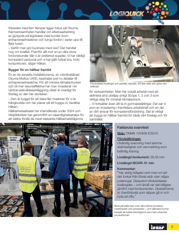 7fr%u00e4ssidan med fem fleropar ligger fokus p%u00e5 Okuma. K%u00e4rnverksamheten handlar om efterbearbetning av gjutgods p%u00e5 legobasis med kunder inom entreprenadmaskiner och tunga fordon i serier upp till flera tusen. %u2013 Varf%u00f6r man g%u00f6r business med oss? Det handlar nog om kvalitet. Framf%u00f6r allt mot en av v%u00e5ra stora fordonskunder d%u00e4r vi %u00e4r preferred supplier. Vi har v%u00e4ldigt kompetent personal och vi har g%u00e5tt hyfsat bra, trots konjunkturen, s%u00e4ger H%u00e5kan.Bygger f%u00f6r en h%u00e5llbar framtidEn av de senaste installationerna, en robotbetj%u00e4nad Okuma Multus U400, bearbetar just nu detaljer till entreprenadmaskiner. F%u00f6r att minska klimatavtrycket och bli mer resurseffektiva har man investerat i en central sk%u00e4rv%u00e4tskeanl%u00e4ggning vilket %u00e4r ovanligt f%u00f6r f%u00f6retag av den h%u00e4r storleken.%u2013 Den %u00e4r byggd f%u00f6r att klara fler maskiner f%u00f6r vi %u00e4r tr%u00e5ngbodda och har planer p%u00e5 att bygga ut, ber%u00e4ttar H%u00e5kan.H%u00e5llbarhetsarbetet har intensifierats under 2024 och V%u00e4xj%u00f6fabriken har genomf%u00f6rt en v%u00e4sentlighetsanalys f%u00f6r att b%u00e4ttre f%u00f6rst%u00e5 de mest relevanta h%u00e5llbarhetsfr%u00e5gorna f%u00f6r verksamheten. Man har ocks%u00e5 arbetat med att definiera sina utsl%u00e4pp enligt Scope 1, 2 och 3 som viktiga steg f%u00f6r minskat klimatavtryck.%u2013 Vi forts%u00e4tter %u00e4ven att ta in gymnasiel%u00e4rlingar. Det ser vi som en investering i framtidens arbetskraft och en del av v%u00e5rt ansvar f%u00f6r kompetensf%u00f6rs%u00f6rjning. Det %u00e4r viktigt att bygga en h%u00e5llbar framtid f%u00f6r b%u00e5de v%u00e5rt f%u00f6retag och f%u00f6r samh%u00e4llet.F%u00f6rdubblad livsl%u00e4ngd och perfekt resultat. Ett litet sk%u00e4r kan g%u00f6ra stor skillnad.Bara p%u00e5 plats kan man l%u00e4ra k%u00e4nna kundens maskinpark och produkter %u2013 och d%u00e4rmed kunna f%u00f6resl%u00e5 de b%u00e4sta l%u00f6sningarna som kan utveckla produktionen.Faktaruta svarvtestSk%u00e4r: CNMA 120408 IC5010F%u00f6ruts%u00e4ttningar:Utv%u00e4ndig svarvning med samma sk%u00e4rhastighet och varvmatning som befintlig l%u00f6sningLivsl%u00e4ngd konkurrent: 28,33 minLivsl%u00e4ngd ISCAR: 51 minKommentar: %u201dHar aldrig tidigare varit med om att det funkat fr%u00e5n f%u00f6rsta sk%u00e4r utan n%u00e5gra justeringar. Dessutom f%u00f6rdubblades livsl%u00e4ngden %u2013 och %u00e4nd%u00e5 var det billigare j%u00e4mf%u00f6rt med konkurrenten. Operat%u00f6rerna %u00e4r %u00f6verf%u00f6rtjusta som slipper g%u00e5 in och byta s%u00e5 ofta.%u201d