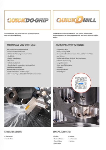 Abstechsytem mit prismatischer Spanngeometrie und effizienter K%u00fchlung.EINSATZGEBIETE:%u2022 Abstechen%u2022 EinstechenMERKMALE UND VORTEILE:%u2022 Prismatische Spanngeometrie%u2022 Interne K%u00fchlmittelkan%u00e4le%u2022 Effiziente K%u00fchlung von zwei Seiten%u2022 Stabilit%u00e4t %u2022 Lange Standzeiten%u2022 Pr%u00e4zision%u2022 Wiederholbarkeit %u2022 Best%u00e4ndigkeit gegen%u00fcber Schnittkr%u00e4ften%u2022 Einfache Spanabfuhr%u2022 Hohe Oberfl%u00e4cheng%u00fcten %u2022 Unterschiedliche Ausf%u00fchrungen %u2022 F%u00fcr zweiseitige helikale DOGRIP-Schneideins%u00e4tze EINSATZGEBIETE:%u2022 Fr%u00e4sen%u2022 Taschenfr%u00e4sen%u2022 Tauchfr%u00e4sen%u2022 Nutfr%u00e4senMERKMALE UND VORTEILE:%u2022 Kombiwerkzeug%u2022 Vierschneidige WSP %u2022 Zwei unterschiedlichen Geometrien je WSP zum Fr%u00e4sen und Bohren%u2022 Hochdruckk%u00fchlung direkt in der Schnittzone%u2022 Schnelle Bearbeitung%u2022 Lange Standzeit%u2022 Hohe Oberfl%u00e4cheng%u00fcte%u2022 Effizienz%u2022 Prozesssicherheit%u2022 Vielseitigkeit%u2022 Bohren%u2022 Aufbohren%u2022 Senken ISCARs Kombi-Linie zum Bohren und Fr%u00e4sen vereint zwei unterschiedliche Schneidengeometrien auf einer Wendeschneidplatte.