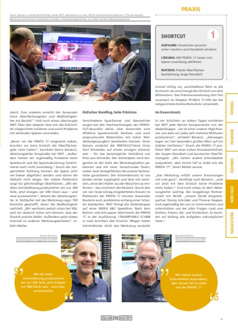 PRAXISFR%u00c4SEN BOHREN DREHEN STECHEN INDUSTRIENMit der alten Schneidl%u00f6sung produzierten wir nur 200 Teile, jetzt kriegen wir 500 St%u00fcck raus %u2013 und zwar prozesssicher.Wir hatten andere Schneids%u00e4tze ausprobiert, aber keiner lief so stabil wie die PENTA 17.Damir Balukcic, Abteilungsleiter Einspindler bei WSTBerthold M%u00fcller, Prozessoptimierer bei WSTDamir Balukcic und Berthold M%u00fcller, beide WST, diskutieren mit den ISCAR-Au%u00dfendienstmitarbeitern Thomas Nopper, Beratung und Verkauf, und Danny Schr%u00f6del, Anwendungstechniker, (v.l.) %u00fcber weitere Werkzeugsysteme.damit. Zum anderen erreicht der Anwender hohe Oberfl%u00e4cheng%u00fcten und Ma%u00dfhaltigkeiten am Bauteil.%u201c Und noch etwas %u00fcberzeugte WST: %u00dcber den Adapter l%u00e4sst sich das K%u00fchlmittel zielgerichtet zuf%u00fchren und somit Probleme mit st%u00f6renden Sp%u00e4nen vermeiden.%u201eBevor wir die PENTA 17 eingesetzt haben, konnten wir beim Einstich die Oberfl%u00e4cheng%u00fcte nicht halten%u201c, berichtet Damir Balukcic, Abteilungsleiter Einspindler bei WST. %u201eAu%u00dferdem hatten wir regelm%u00e4%u00dfig Probleme beim Spanbruch und die Spanevakuierung funktionierte auch nicht zuverl%u00e4ssig.%u201c Durch die zielgerichtete K%u00fchlung k%u00f6nnen die Sp%u00e4ne jetzt viel besser abgef%u00fchrt werden und st%u00f6ren die Abl%u00e4ufe nicht l%u00e4nger. Der stabile Plattensitz sorgt f%u00fcr gleichm%u00e4%u00dfige Oberfl%u00e4chen. %u201eMit der alten Schneidl%u00f6sung produzierten wir nur 200 Teile, jetzt kriegen wir 500 St%u00fcck raus %u2013 und zwar prozesssicher%u201c, betont der Abteilungsleiter. In Testl%u00e4ufen hat das Werkzeug sogar 700 Einstiche geschafft, bevor die Ma%u00dfhaltigkeit nachlie%u00df. %u201eWir wechseln jedoch schon bei 500, weil wir dadurch sicher sein k%u00f6nnen, dass der Einstich pr%u00e4zise bleibt. Au%u00dferdem passt dieses Intervall zu anderen Werkzeugwechseln%u201c, erkl%u00e4rt M%u00fcller.Einfaches Handling, hohe Pr%u00e4zisionVerschiedene Spanformer und Geometrien sorgen bei den Stechwerkzeugen der PENTACUT-Baureihe daf%u00fcr, dass Anwender eine effektive Spankontrolle besitzen und auch anspruchsvolle Materialien mit hoher Wiederholgenauigkeit bearbeiten k%u00f6nnen. Ihren Namen verdankt die PENTACUT-Serie ihren f%u00fcnf Schneiden auf einem einzigen Schneidsatz %u2013 f%u00fcr das bestm%u00f6gliche Verh%u00e4ltnis von Preis pro Schneide. Der Schneidsatz wird tangential an der Seite des Werkzeughalters geklemmt und mit einer Torxschraube fixiert, wobei zwei Anlagefl%u00e4chen die pr%u00e4zise Spitzenh%u00f6he garantieren. Der Schneideinsatz ist von beiden Seiten zug%u00e4nglich und l%u00e4sst sich wechseln, ohne den Halter aus der Maschine zu entfernen %u2013 das minimiert die R%u00fcstzeit. Durch den um vier Grad schr%u00e4g eingebetteten Einsatz im Plattensitz der PENTA 17 k%u00f6nnen Anwender Bauteile auch problemlos entlang einer Schulter bearbeiten. WST fertigt die Abdeckkappe auf einer INDEX ABC Speedline. Nach dem Bohren und Schruppen %u00fcbernimmt die PENTA 17 in der Ausf%u00fchrung 17N200P100LS IC1008 in zwei Schritten den Einstich. Wegen hoher Schnittdr%u00fccke sticht das Werkzeug zun%u00e4chst einmal mittig vor, anschlie%u00dfend f%u00e4hrt es die Konturen ab und erzeugt den Einstich von drei Millimetern. Das Pr%u00e4zisionswerkzeug sitzt fest verankert im Adapter PCADLS 17-JHP, der die zielgerichtete K%u00fchlmittelzufuhr sicherstellt.Im DauereinsatzIn vier Schichten an sieben Tagen entstehen bei WST jede Woche Komponenten wie der Abdeckkappe. %u201eSie ist einer unserer High-Runner, von dem wir jedes Jahr mehrere Millionen produzieren%u201c, schildert Balukcic. %u201eDeswegen legen wir hier besonders gro%u00dfen Wert auf ein stabiles Verfahren.%u201c Durch die PENTA 17 profitiert WST von einer hohen Prozesssicherheit, der langen Standzeit und konstanter Oberfl%u00e4cheng%u00fcte. %u201eWir hatten andere Schneids%u00e4tze ausprobiert, aber keiner lief so stabil wie die PENTA 17%u201c, blickt M%u00fcller zur%u00fcck.%u201eDas Werkzeug erf%u00fcllt unsere Erwartungen voll und ganz%u201c, best%u00e4tigt auch Balukcic, %u201eweil wir jetzt mit dem Einstich keine Probleme mehr haben.%u201c Und noch etwas ist dem Abteilungsleiter wichtig: Die langj%u00e4hrige Partnerschaft mit ISCAR. %u201eUnsere ISCAR Ansprechpartner Danny Schr%u00f6del und Thomas Nopper, sind regelm%u00e4%u00dfig bei uns im Unternehmen und unterst%u00fctzen uns bei allen Fragen rund ums Drehen, Fr%u00e4sen, Ab- und Einstechen. So konnten wir bislang alle Aufgaben unkompliziert l%u00f6sen.%u201cSHORTCUTAUFGABE: Einstechen prozesssicher machen und Standzeit erh%u00f6henL%u00d6SUNG: Mit PENTA 17 lassen sich Sp%u00e4ne zuverl%u00e4ssig abf%u00fchren NUTZEN: Pr%u00e4zise Oberfl%u00e4chenbearbeitung, lange Standzeit i39