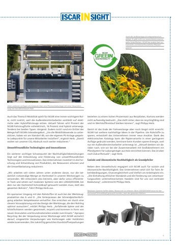 Auch das Thema E-Mobilit%u00e4t spielt f%u00fcr ISCAR eine immer wichtigere Rolle, nicht zuletzt, weil die Au%u00dfendienstmitarbeiter verst%u00e4rkt auf elektrische oder Hybridfahrzeuge setzen. Aktuell fahren acht Prozent der ISCAR-Fahrzeugflotte vollelektrisch, 16 Prozent sind hybrid unterwegs. Tendenz bei beiden Typen: steigend. Zudem nutzt rund ein Drittel der Belegschaft ISCARs Jobradangebot. %u201eUm die Mobilit%u00e4tswende zu unterst%u00fctzen, haben wir am Standort 40, von der eigenen PV-Anlage gespeiste Ladepunkte f%u00fcr unsere Mitarbeiter installiert%u201c, erg%u00e4nzt Herb. %u201eDamit wollen wir unseren CO2-Abdruck noch weiter reduzieren.%u201cUmweltfreundliche Technologien und InnovationenEin weiterer wichtiger Schwerpunkt der Nachhaltigkeitsbem%u00fchungen liegt auf der Entwicklung und F%u00f6rderung von umweltfreundlichen Technologien und Innovationen. Das Unternehmen investiert in die Forschung und Entwicklung von Produkten, die Ressourcen schonen und die Umweltbelastung reduzieren.%u201eWir arbeiten seit vielen Jahren unter anderem daran, nur die tats%u00e4chlich notwendige Menge an Hartmetall in unseren Werkzeugen zu verwenden. Wir entwickeln also kleinere, aber daf%u00fcr umso effizientere Tools und setzen auf modulare Systeme wie den LOGIQ3CHAM, bei dem nur der Hartmetall-Schneidkopf getauscht werden muss, statt des gesamten Bohrers%u201c, f%u00fchrt Philipp Herb aus.Ein sparsamer Umgang mit den Rohstoffen ist auch bei der Werkzeugproduktion das A und O. %u201eDie Sinterpressen der Schneidplattenfertigung arbeiten beispielsweise verlustfrei. Das erreichen wir durch eine clevere Vorausplanung und das Design der Werkzeuge, die den Rohling optimal ausnutzen%u201c, erkl%u00e4rt Philipp Herb. %u201eAnfallende Sp%u00e4ne und der Schleifschlamm werden gesammelt, recycelt und kommen in Form von neuen Granulaten und Grundmaterialien wieder zum Einsatz.%u201c Apropos Recycling: Bei der Verpackung seiner Werkzeuge setzt ISCAR vermehrt darauf, eingesetzte Verpackungen wie Kartonagen oder Holzkisten wiederzuverwenden. Die zuk%u00fcnftig genutzten Kunststoffverpackungen bestehen zu einem hohen Prozentsatz aus Rezyklaten, Kartons werden nicht aufwendig bedruckt. %u201eDas stellt sicher, dass sie recyclingf%u00e4hig sind und im Wertstoffkreislauf bleiben k%u00f6nnen%u201c, sagt Philipp Herb.Damit ist das Ende der Fahnenstange aber noch l%u00e4ngst nicht erreicht.ISCAR hat weitere nachhaltige Ideen in der Pipeline. Um Rohstoffe zu sparen, entwickelt das Unternehmen immer neue Ans%u00e4tze. Dank des elektronischen Katalogs kann die Papiervariante in einer geringeren Auflage gedruckt werden, Seminare beim Kunden sparen Energie, weil nur ein Au%u00dfendienstmitarbeiter unterwegs ist. %u201eAktuell denken wir dar%u00fcber nach, wie wir bei der Zusammenarbeit mit Gro%u00dfabnehmern ein Pfandsystem f%u00fcr Ladungstr%u00e4ger aus Holz einrichten k%u00f6nnen. Das ist aber noch Zukunftsmusik%u201c, sagt Herb.Soziale und %u00f6konomische Nachhaltigkeit als GrundpfeilerNeben dem Umweltschutz engagiert sich ISCAR auch f%u00fcr soziale und %u00f6konomische Nachhaltigkeit. Das Unternehmen setzt sich f%u00fcr faire Arbeitsbedingungen, Chancengleichheit und Vielfalt am Arbeitsplatz ein.%u201eDie Einhaltung ethischer Standards und die F%u00f6rderung von verantwortungsvollem unternehmerischem Handeln sind f%u00fcr uns von zentraler Bedeutung%u201c, unterstreicht Philipp Herb.Unter anderem verf%u00fcgen die Geb%u00e4ude %u00fcber eine Photovoltaikanlage mit einer Gesamtleistung von fast 600 Kilowatt Peak.Auch die Au%u00dfenanlage ist entsprechend angelegt. Es gibt nicht nur ausreichend unversiegelte Sickerfl%u00e4chen, ISCAR hat zudem fast nur heimische und bienenfreundliche Pflanzen gesetzt.Modulare Systeme helfen dabei, Ressourcen zu schonen. Beim LOGIQ3CHAM muss nur der Hartmetall-Schneidkopf getauscht werden, statt des gesamten Bohrers.9